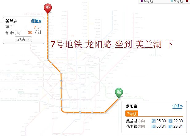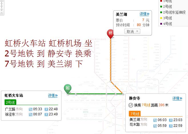路線:(虹橋火車站、虹橋機場)坐 2號地鐵 到 靜安寺換乘 7號地鐵到 美蘭湖 下