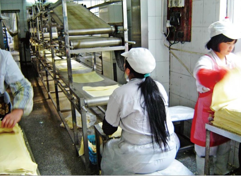 薄豆皮機(jī)將豆?jié){點腦,打花,經(jīng)澆注機(jī)潑于包布上,再經(jīng)過壓機(jī)壓榨,剝布機(jī)剝離即可得豆皮。