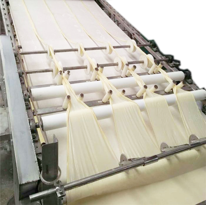 豆?jié){放入蒸發(fā)鍋后,經(jīng)保溫吹涼過程,將鍋表面結(jié)皮的產(chǎn)品送入輸送帶,自動卷起、烘干一體機(jī),如此反復(fù),至將